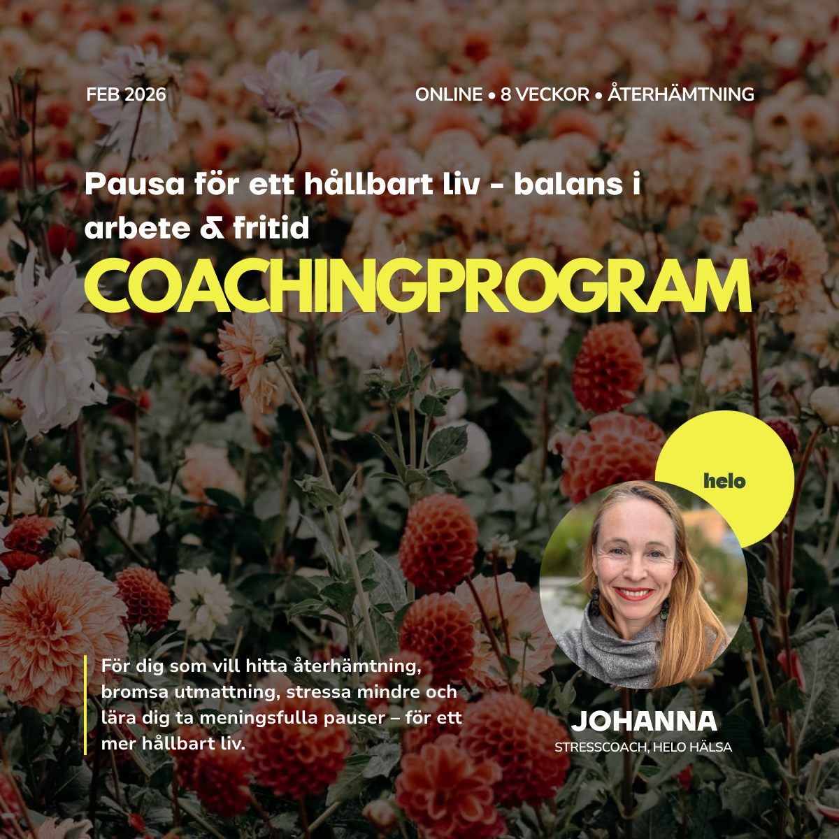 Är du i riskzonen för utbrändhet och behöver bli bättre på stresshantering? Pausa för ett hållbart liv – balans i arbete & fritid är ett program där du tillsammans med vår stresscoach Johanna lär dig att skapa meningsfulla pauser i vardagen – med inslag av rörelse, andning och reflektion som minskar stresspåslag och hjälper dig att återfå energi.